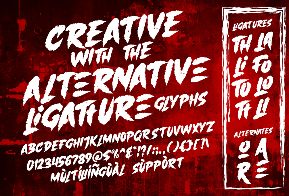 Blaster has a strong, aggressive look with sharp lines and curves. This font has hard corners and is slightly tilted towards the vertical, giving it a sharp and intimidating impression. accompanied by additional ligatures and alternates that you can adjust yourself. Can be applied as film poster designs, book covers, quotes, etc.